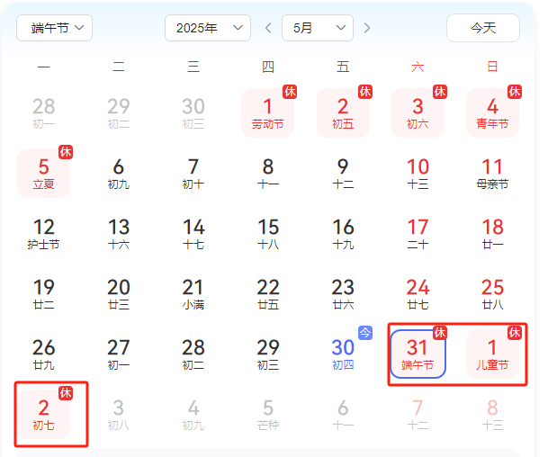 2025年端午節放假時間:5月31日(星期六)至6月2日(周一),共放假3天;6月3日(星期二)正常上班。