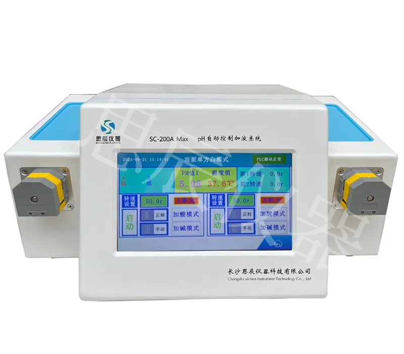 本系統是長沙思辰儀器研發團隊最新研制開發的第三代高精度pH自動控制系統,為高等院校、科研院所實驗室,中外研發企業及研發生產等部門精心設計制造的,并且擁有完全自主的知識產權。獲得了國家一項發明專利【ZL201410349779.8】及多項實用新型專利【ZL201721373766.X】;【ZL 201420406067.0】;【ZL201420406055.8】。整機采用PLC控制,并與定制的蠕動泵聯機進行加酸或加堿來自動調節容器中溶液pH的預設值。是催化、制藥、化工、電鍍、生化、生物發酵、植物提取物車間,科院院所等實驗室或生產中小試場所理想的pH監測自動控制系統。